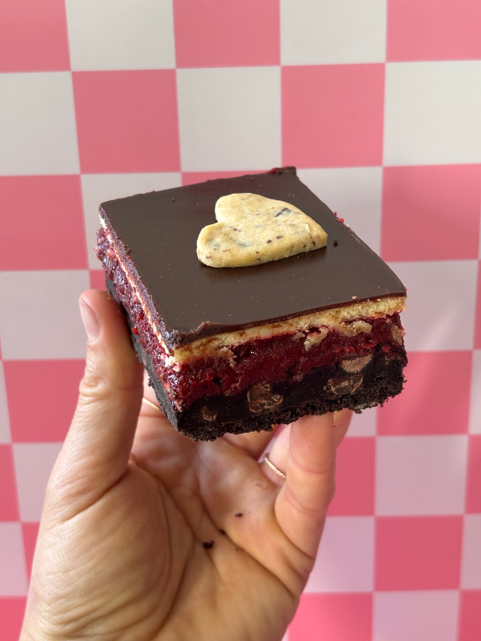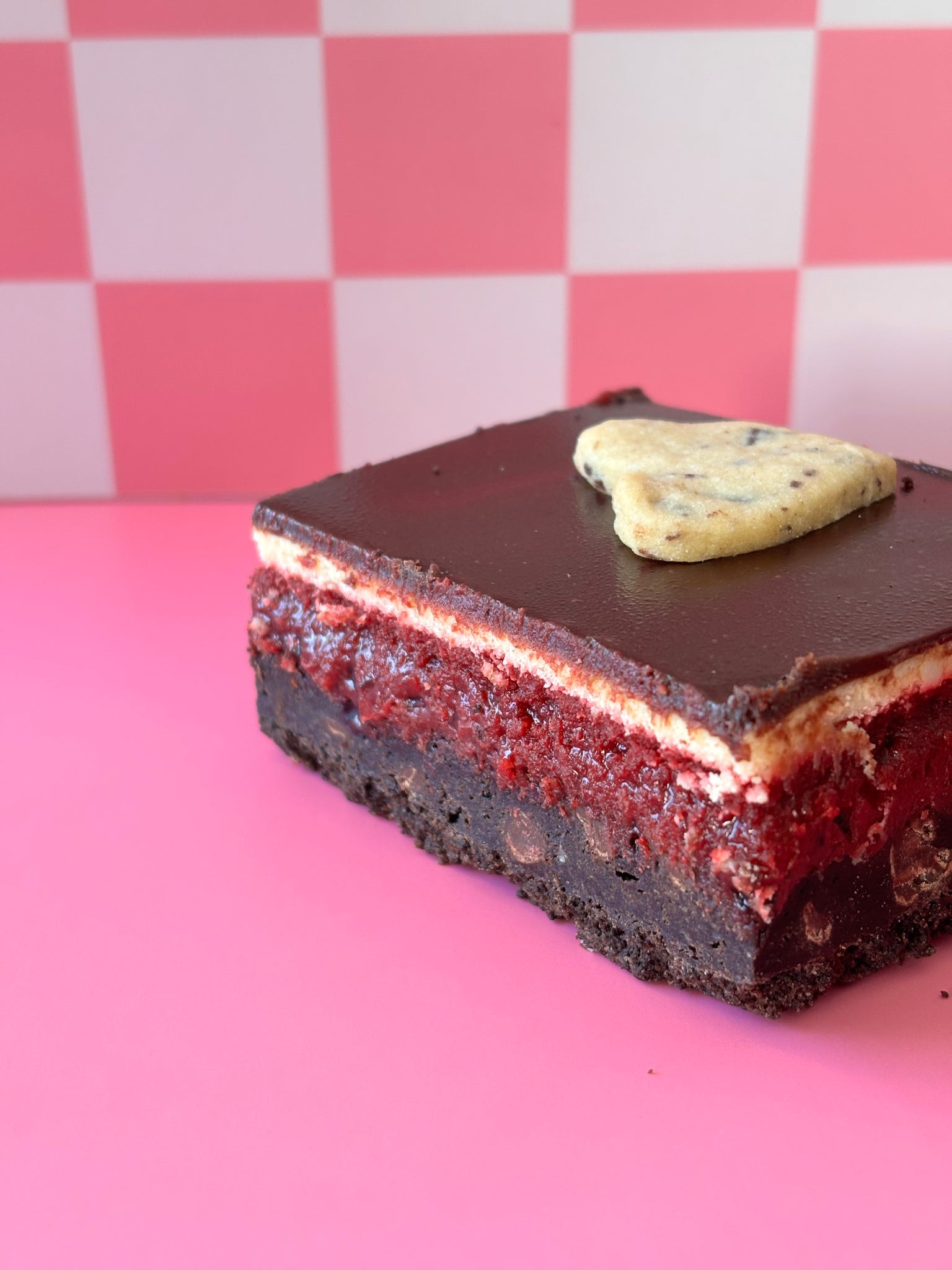 A decadent Cookie Bar made on an Oreo crumb base, with a layer of double chocolate cookie dough, a thin slip of raspberry jam to balance the sweetness, rich red velvet brownie layer, topped with a vanilla cheesecake, Nutella ganache and a chocolate chip cookie heart!