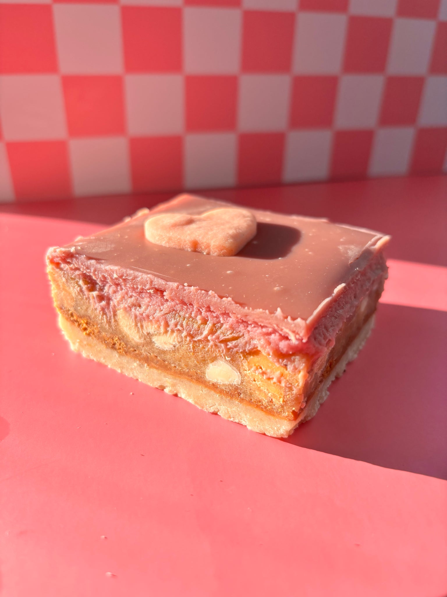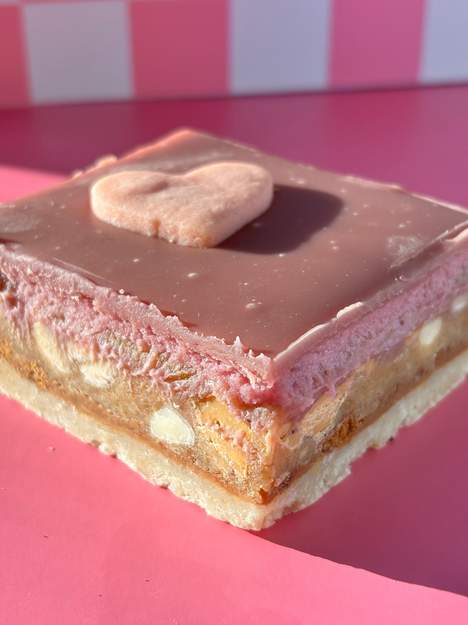A stunning Cookie Bar made on a lemony shortbread base with a layer of dulce de leche and crushed up Biscoff cookies. Next is a brown butter blondie layer with white chocolate and caramelized white chocolate chunks, topped with a raspberry cheesecake layer and a Ruby chocolate glaze, and finally decorated with a heart-shaped sugar cookie! This Cookie Bar is a work of art, honestly.
