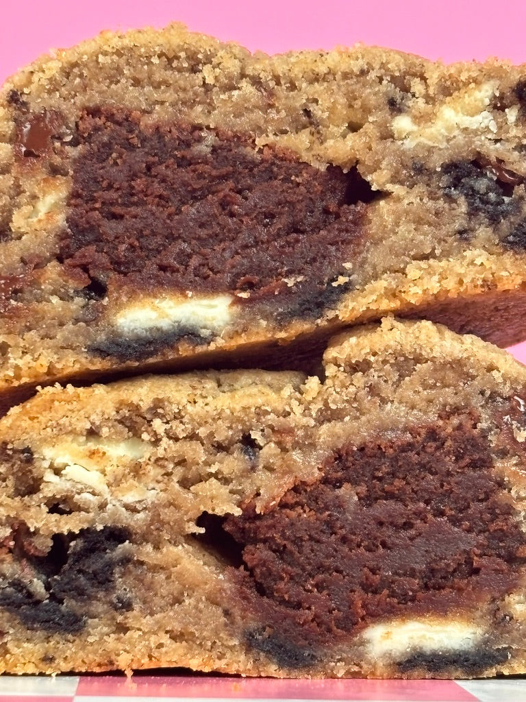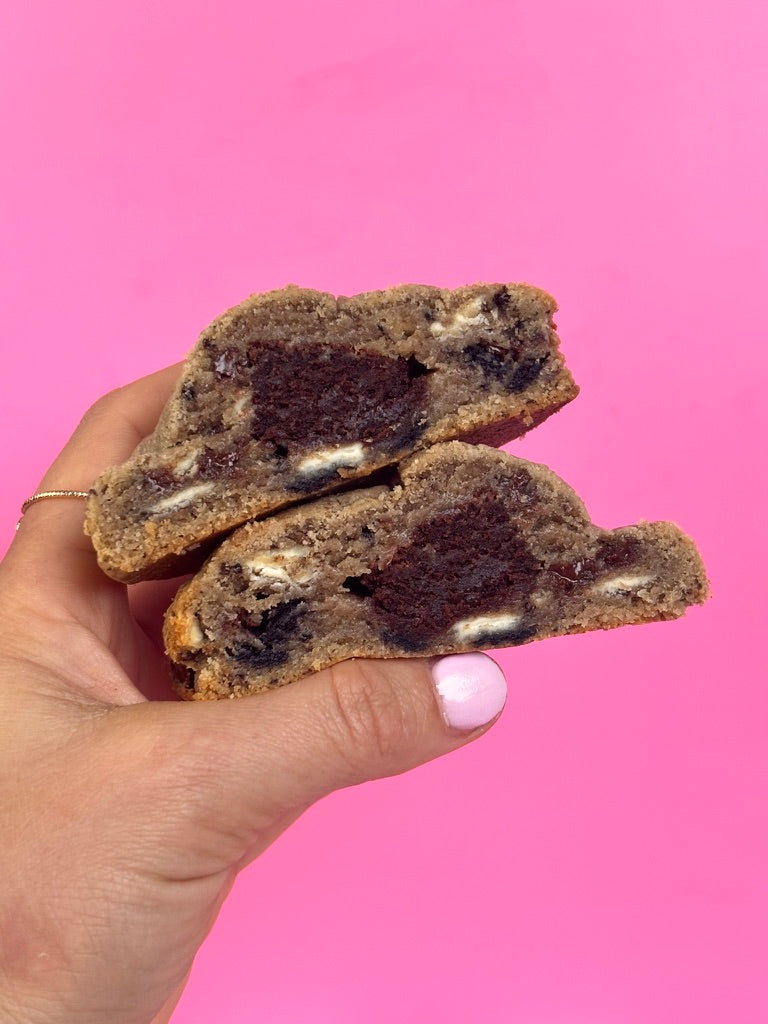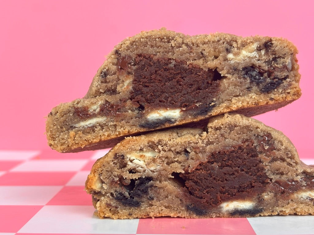 Indulge in the Melting Pot, a fudgy delight packed with Oreos, creamy white chocolate, and rich semi-sweet chocolate, STUFFED with Kat's fudgey brownie! Each bite melts in your mouth, delivering a deliciously playful twist on classic flavours that will satisfy your sweetest cravings.