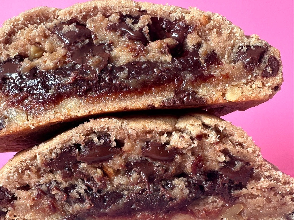 We give you a chocolate chip + walnut cookie, STUFFED with rich and fudgy vegan brownie batter!